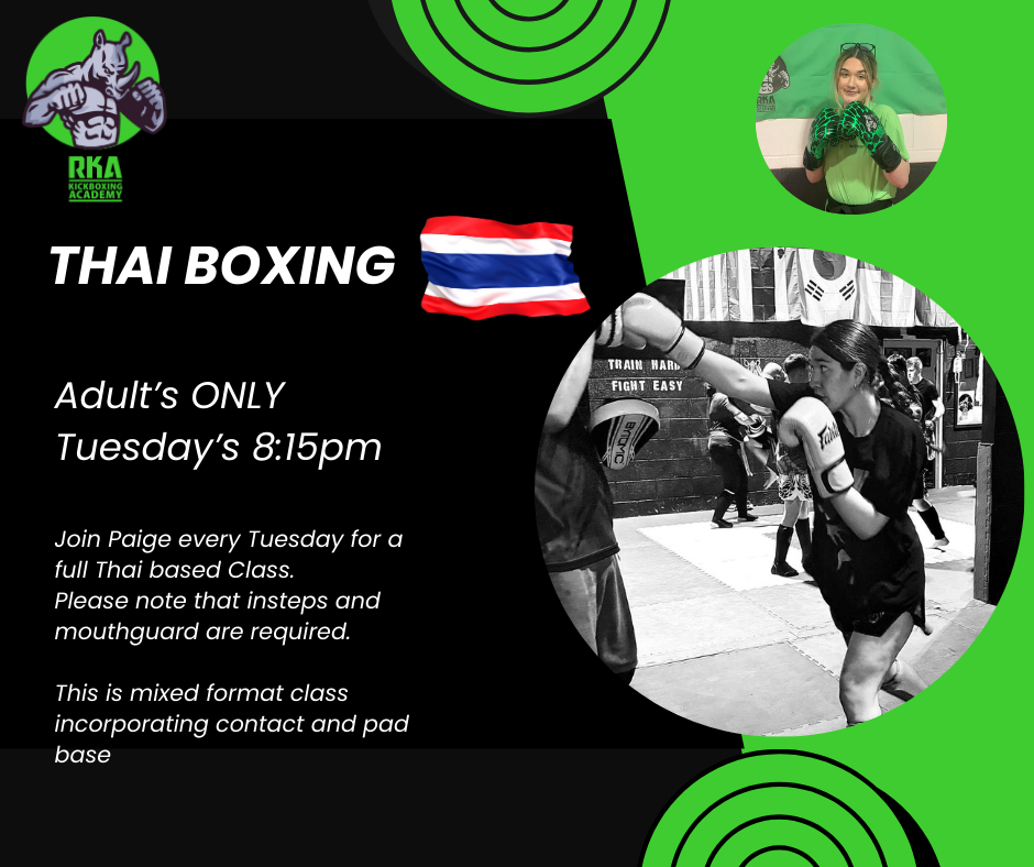 Join our CEO and Chief Instructor Paige every Tuesday for a dedicated Adults only Muay Thai class working on various techniques, drills, clinching and light sparring movement.